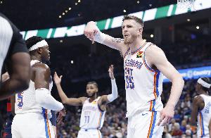 上半场比赛,雷霆中锋哈滕进攻端主要是策应,他出战11分33秒,一次出手都没有,也没有得分,拿到6篮板6助攻,正负值+10。