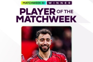 体育资讯3月18日讯 英超官方消息,曼联中场B费当选联赛第30轮最佳球员。