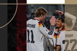 德国队社媒发布了为此役制作的海报,内容为球员们庆祝的场景,沃尔特马德、劳姆、萨内出镜。