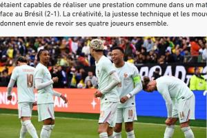 体育资讯03月28日讯 法国队在友谊赛中2-1击败巴西队,法媒《队报》撰写文章,分析了法国队目前的前场四人组,即姆巴佩-埃基蒂克-奥利塞-登贝莱的组合,这四人创造力十足,并且优势互补。文章内容如下: