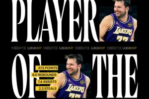 东契奇三月份率领湖人取得15胜2负的战绩,场均爆轰37.5分8.0篮板7.4助攻2.3抢断,单月轰下600分!