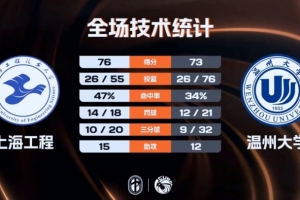末节比赛,上海工程在前三分钟没有得分,温州大学先拿6分稳住局势,但之后的比赛他们突然断电,上海工程打了一波11-0的攻势直接完成反超,孙发航两罚全中,盛家铭绝平三分不中,最终上海工程76-73险胜温州大学。